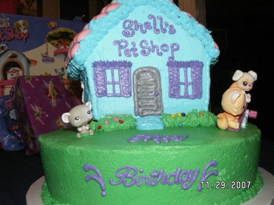 I made this for my neice and nefew who have birthdays that are close together. I baked 2 house cakes and placed them back to back on a round base cake. One side was a pet shop theme the other a garage.