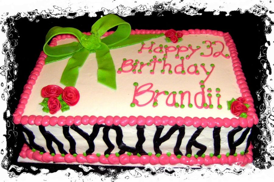 White Chocolate cake with raspberry filling. Cake is almost 5 inches tall!! First time doing zebra stripes and fondant bow/roses. Love the zebra stripes since they were so quick and easy as well as the roses. My bow definately needs work, but practice makes perfect. The bow is brushed with disco dust/glitter and is super sparkly!! TFL