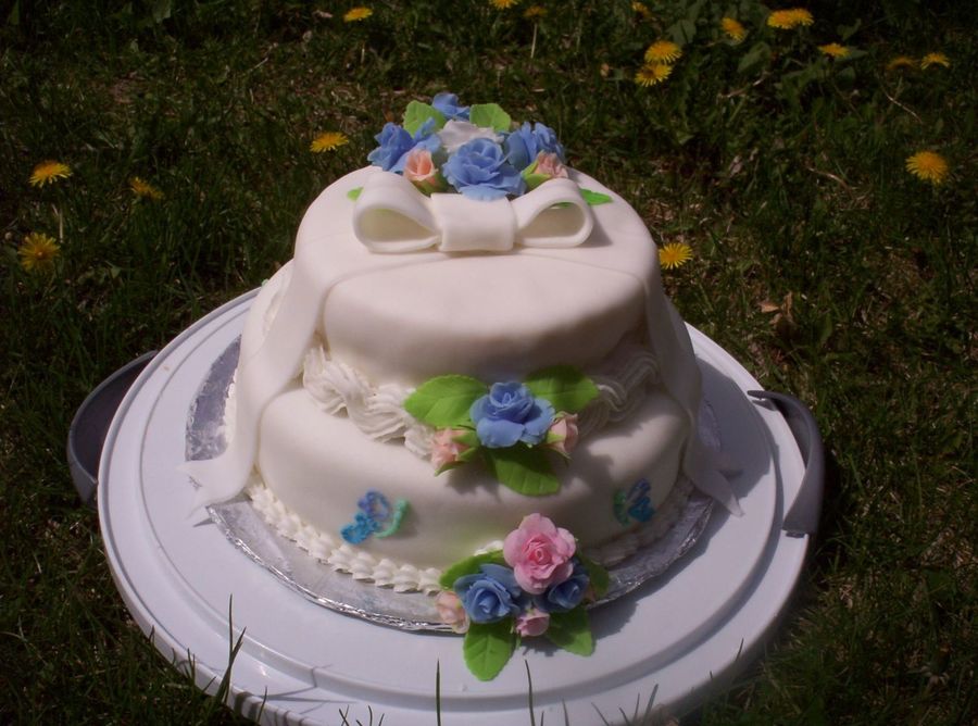 I covered and made the roses and ribbon from store bought fondant. Home-made Wilton Recipe buttercream border. This is the final cake of the last Wilton Method course. I am very proud of myself!