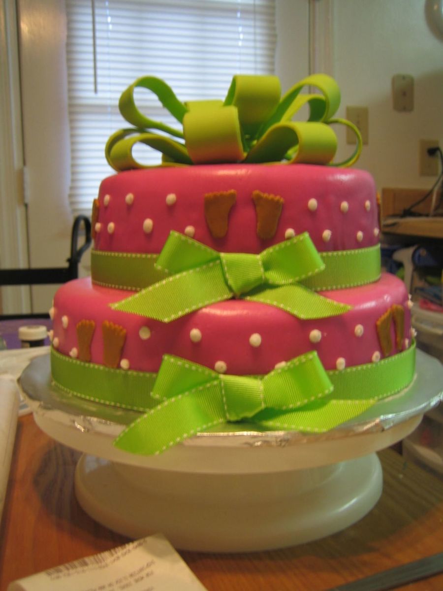 8inch round and 10 inch round WASC with rolled buttercream.First time playing with rolled buttercream. MMF feet and bow. The ribbon is not fondant. Thanks to all the CC for inspiration