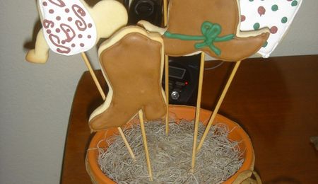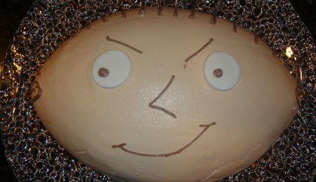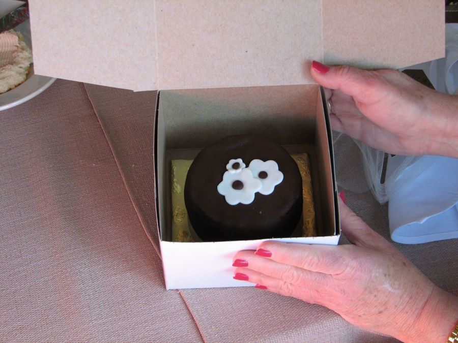 Chocolate fondant, chocolate icing, peanut butter mousse with chocolate chip cake. 4" round cakes made as favors for our engagement luncheon.