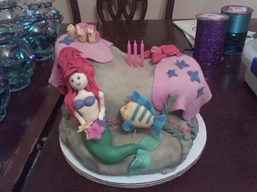 The Ariel cake is one of my earlier cakes. The rock is cake and the decorations are all fondant.