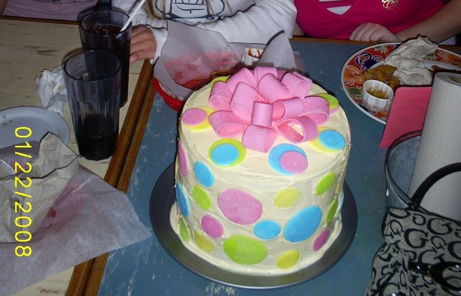 It was my first time to do a cake like this. I used butter cream frosting and Bow and dots are made from fondant. I wanted to cover cake in fondant but I didn't have enough time. I threw all of this together at the last minute for my neice's birthday.