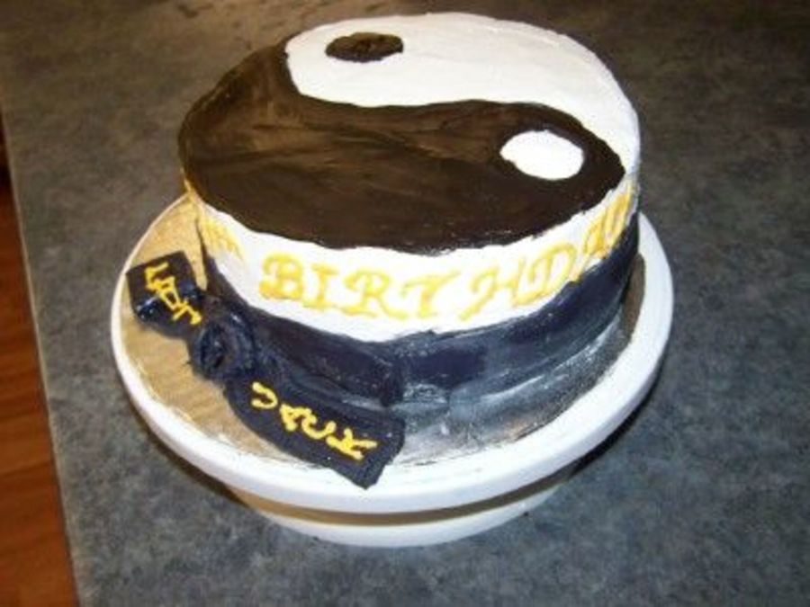 This is a chocolate cake with MMF black belt around it. It was made for my godson who just earned his first degree black belt at the age of 11. He worked very hard for this. My daughter tells me that the symbol on the top is not done properly. My mistake. I am sure that he won't care.