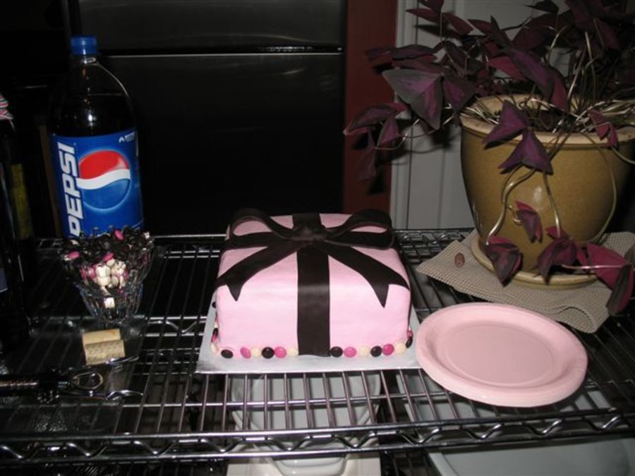 The new mom wanted simple. The invitations had pink, white and brown dots so they wanted m&ms for the border. All buttercream with satin ice bow.