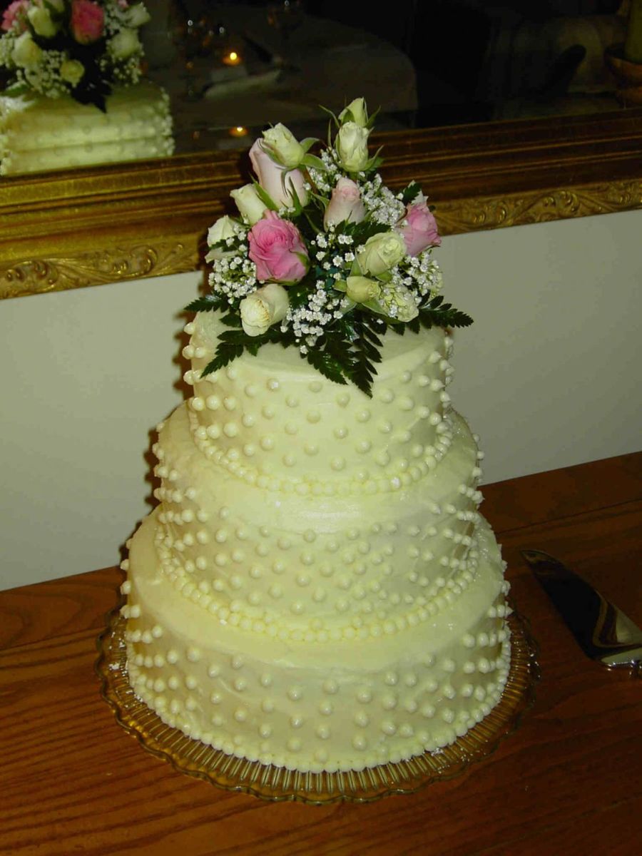 Lemon cream cheese frosting over a white cake. Fresh flowers on top.