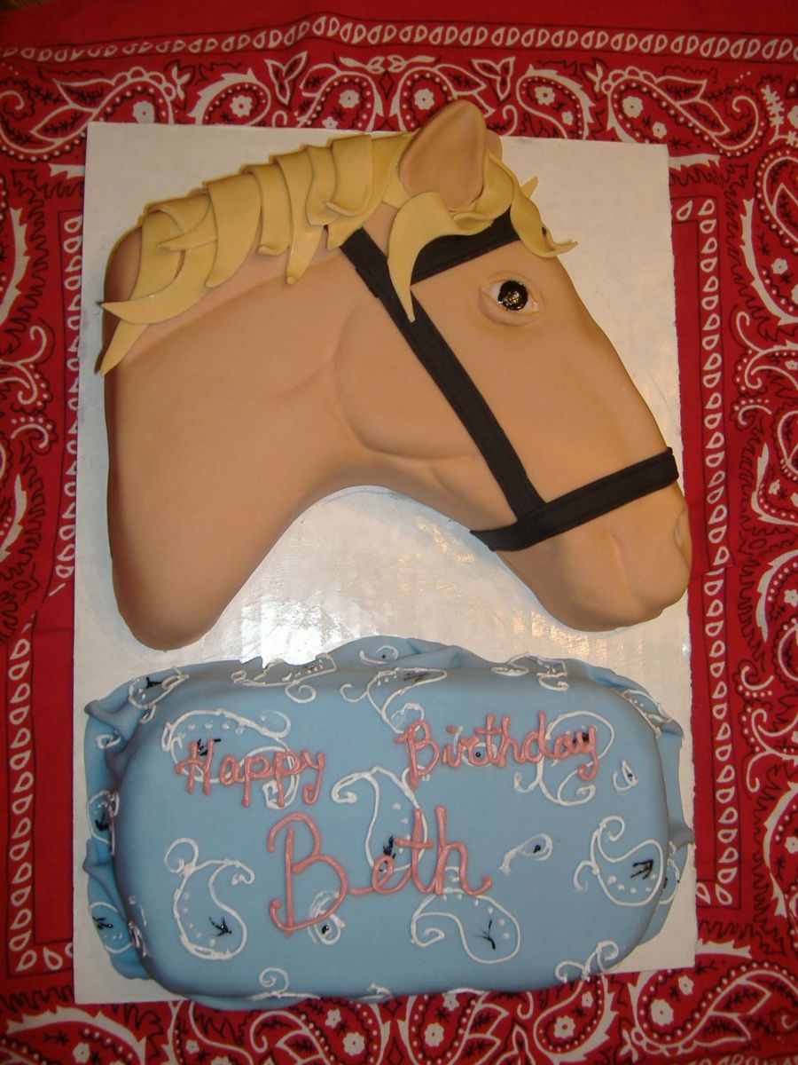 Horse head , Used fondant to cover and decorate horse. Needed more cake for the party, so I added a paisley print bandana. First time doing a horse, thought it came out prettty good. My family thinks that before the ears were on, it looked like a dinosaur. Might use that for next time :)