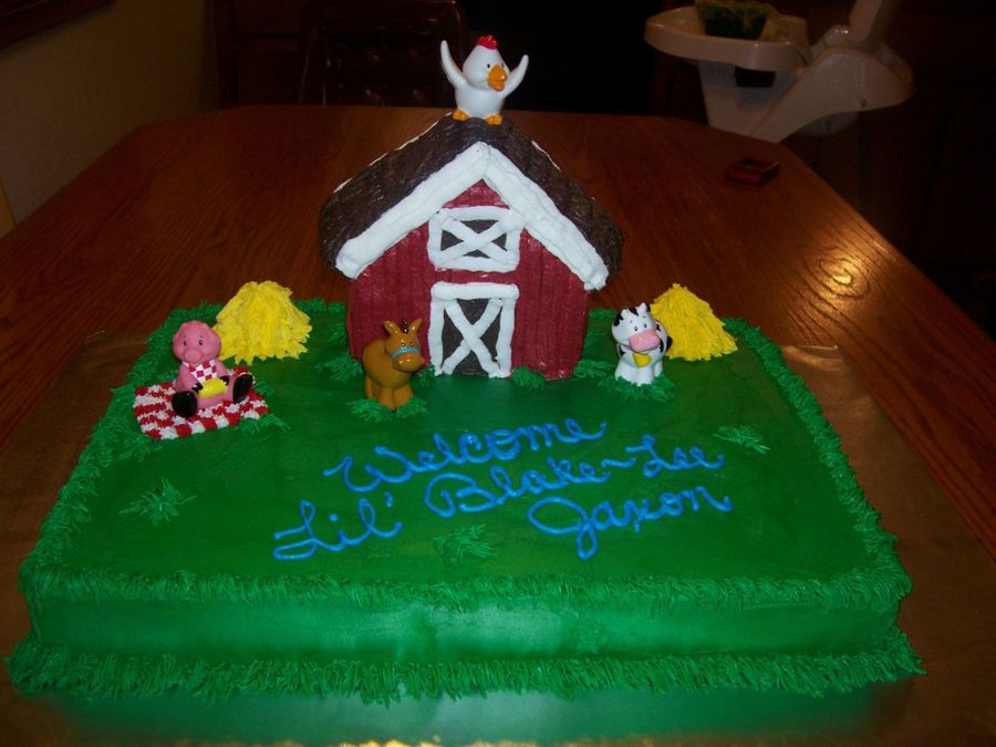 This cake was done to match the babies nursery. I used the Wilton House pan for the barn.....I had inspiration from another CC member for this design. Thank you! All bc , Fisher Price Little People Farm Animals.....so the mother can keep them with her baby's memory album.