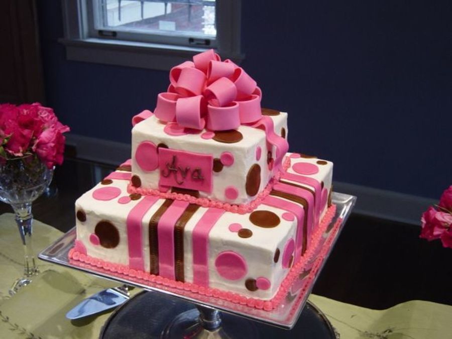 10" and 6" square tiered cake with pink and brown mmf accents and bow