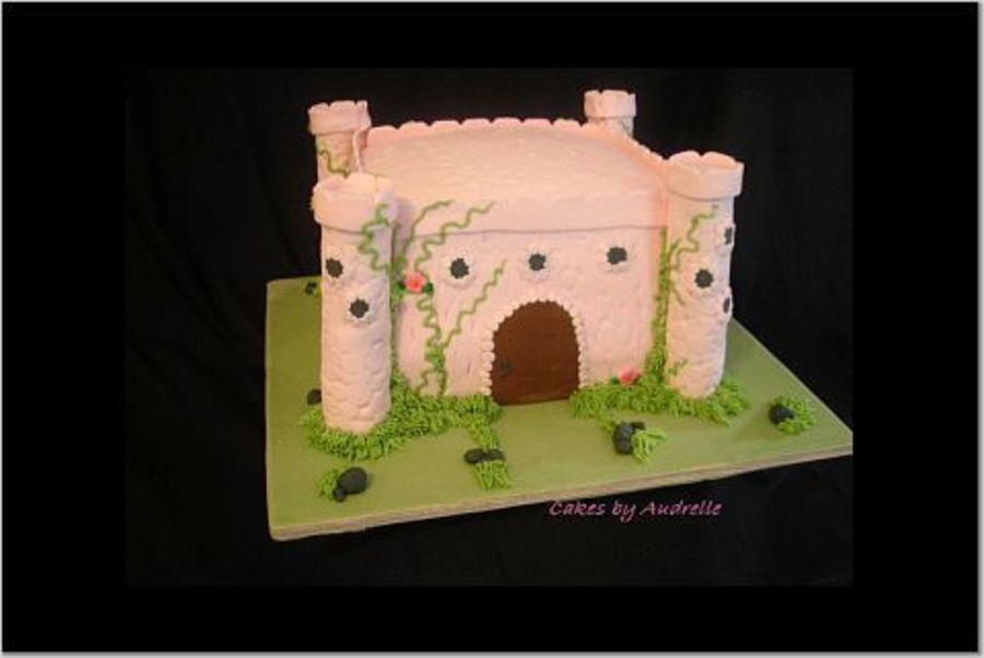 This cake almost had me in tears!! I rolled out the fondant too thin and too much; so when I put it on the cake, it stretched and tore, just a total mess, so, that's the reason for all the grass. Anyway, (4) 8' squares stacked/doweled, covedred in fondant. Towers are Little Debbie Swiss Rolls covered in fondant with fondant turrets.