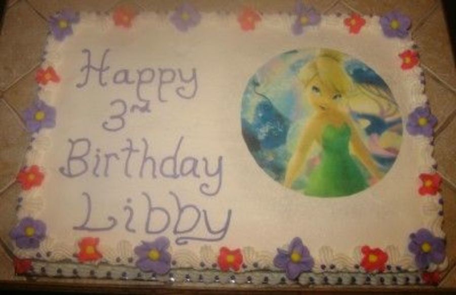 White cake with buttercream frosting, edible image, and fondant flowers.