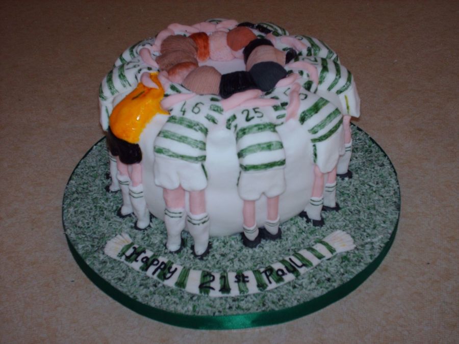 this cake copies the famous glasgow celtic football team huddle that they perform before every match.
