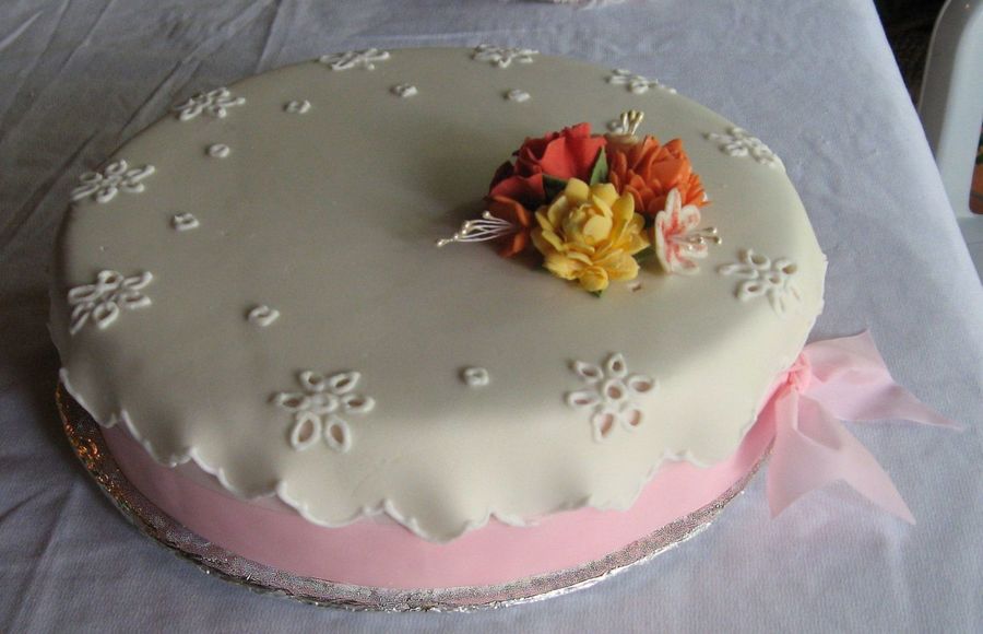 I made this cake for my mom's birthday. It's a rum cake covered with pink mmf and then white overlay. She likes ribbon so i added a pink one for her. The flowers are gum paste. She loved it!