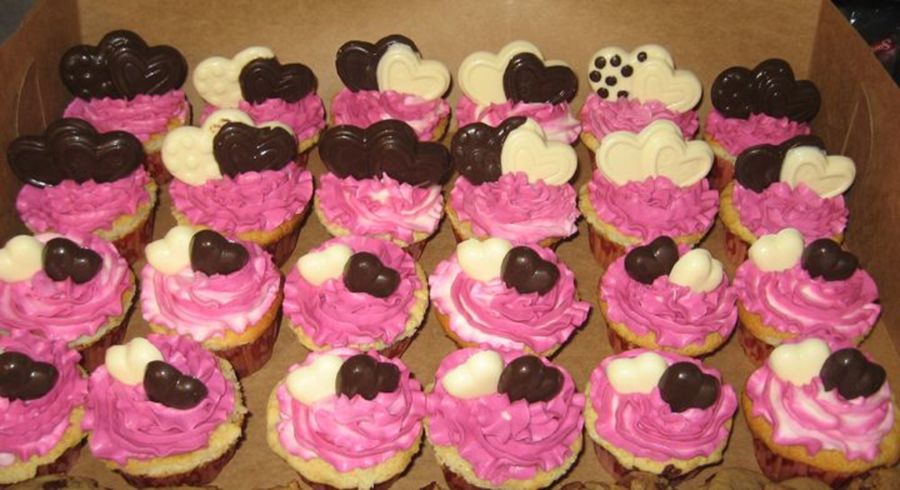 Heart-topped cupcakes (made with Ghirardelli chocolate molded in molds--I am new to this); white chocolate cupcakes with almond buttercream