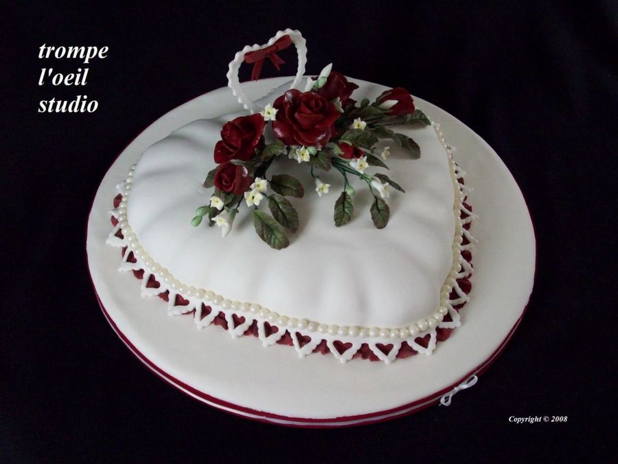 critique subgroup member: What a beautiful cake! I love that you went with more of a maroon than a cherry red. The pearls are beautiful. They look wavy, but I am assuming that is the way they are supposed to look as they follow the cake's ruffled shape. I am generally not a fan of heart shaped anything, but this I love. Fantastic cake perfectly presented. ;-D