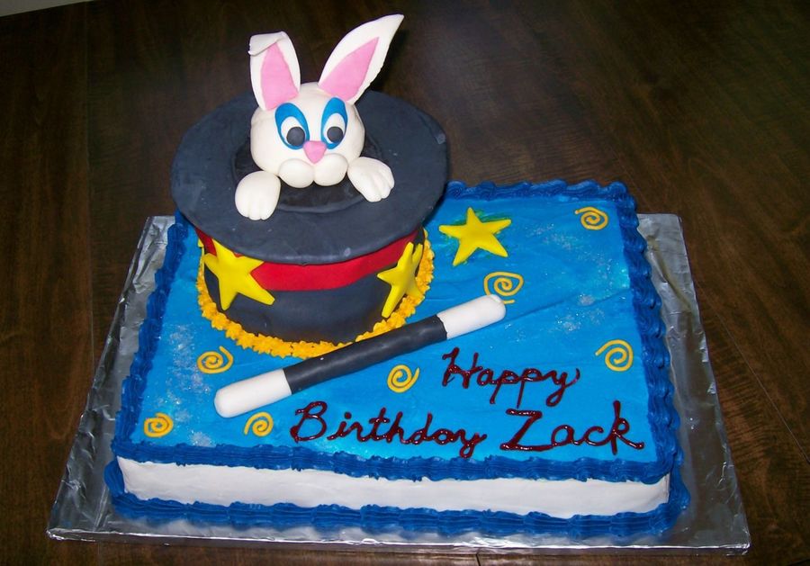 This is a sheet cake decorated with buttercream icing. The hat is a 6" 2layer cake coverered with fondant. The bunny and other decorations are also made from fondant. This cake was made to match the party decorations.