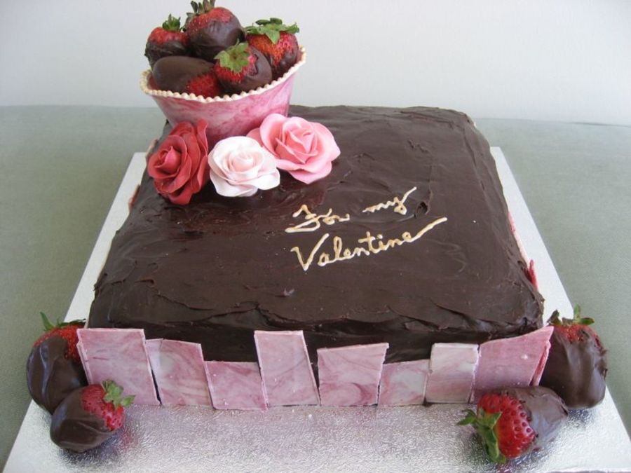 Chocolate mud cake, with loads of chocolate truffle filling and chocolate ganache icing (that didn't turn out as supposed to--it's supposed to have a smooth finish--opps) white chocolate bowl and sides with chocolate dipped strawberries. These are my first gumpaste roses.
