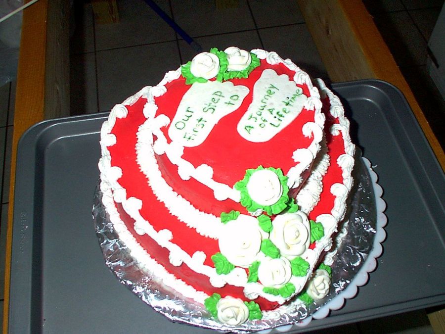 Made this for a friend at work who was celebrating her first aniversay. Each layer is single 10 in and 6 in, lemon w/ rasp filling and lemon buttercream. Royal flowers, and gumpaste feet. Thanks to Doug for the saying, she loved it.