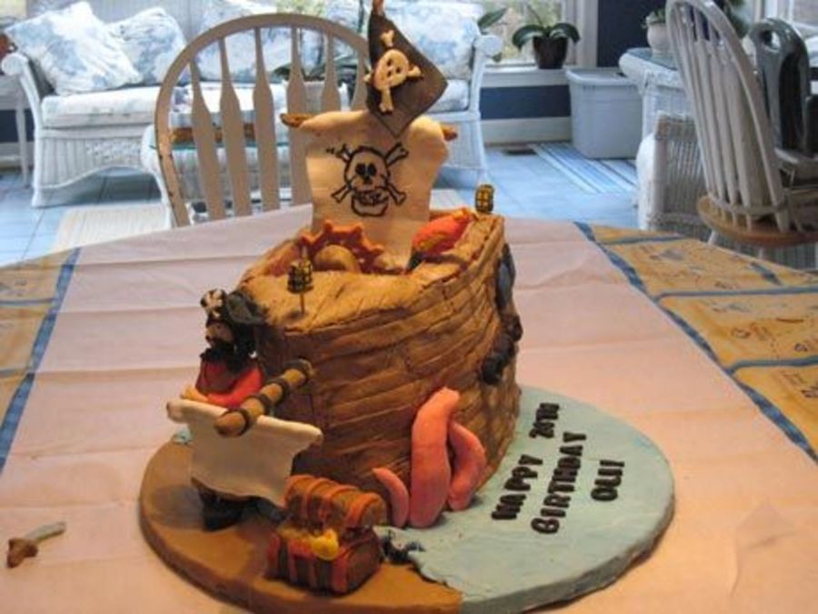 I made this for my husband's birthday. It had a pirate, parrot, kracken, treaure chest, cannons and edible fondant sails.