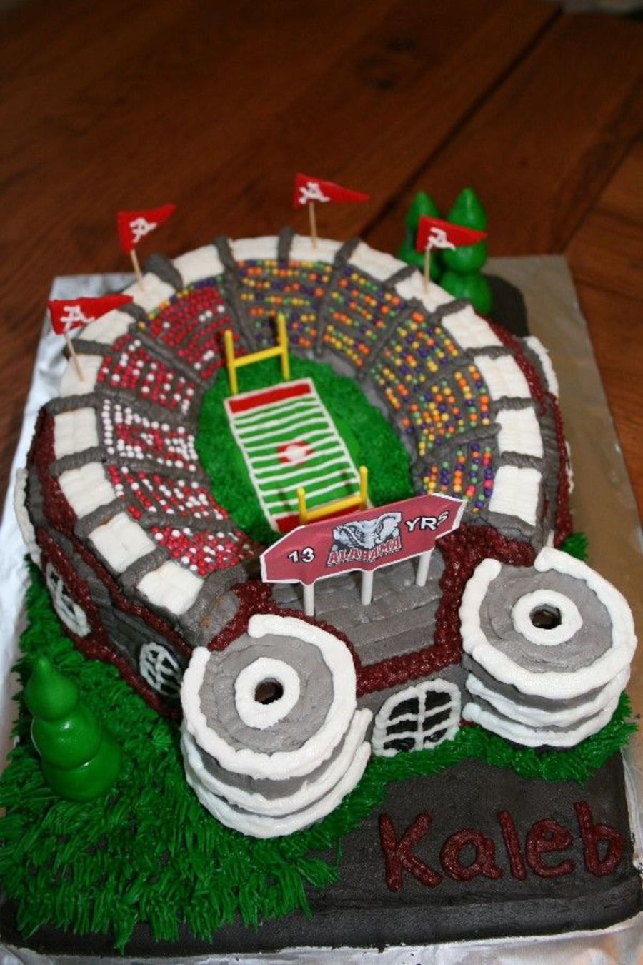 My husband and I made this cake for a friend's son who was turning 13. We used a bundt stadium pan for the top and a jellyroll pan for the base. The trees, flags and field were marshmallow fondant. The scoreboard was not edible. Next time we would consider printing the field and score board on edible paper for more detail. We had difficulty getting the large nonpareils to stick so I had to place each one individually with tweezers.