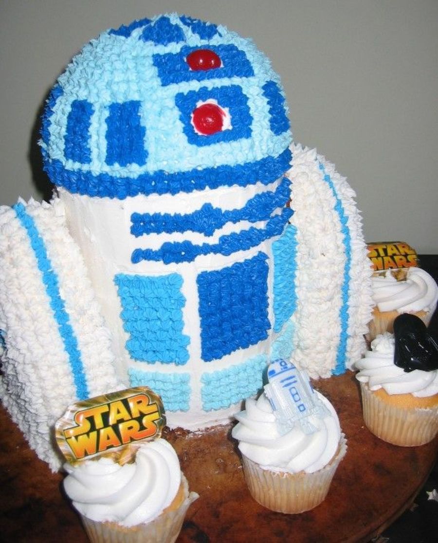 This cake was for our son's 6th birthday. We had seen some examples of vertical R2D2 cakes online and decided to give it a try. We used 4- 6" cakes for the body and half a ball pan for the head. The 'legs' were cut out of a 9x 13 cake. We used some skewers to attach the 'legs'. Fortunately we only had to transport this one from the kitchen to the dining room!