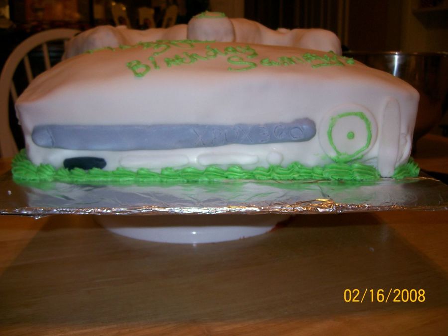 xbox 360 cake- the cake is strawberry with choc pudding in the between the layers. the controllers are rice crispy treats with fondant, junior mints for paddles, skittles for the buttons.