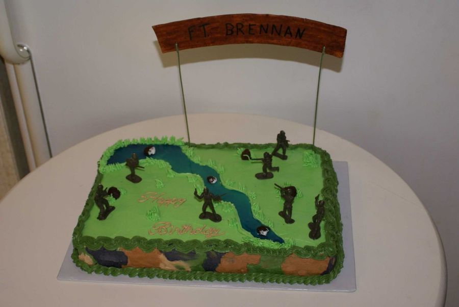 critique group member: I lovethe camo on the sides of the cake! It looks like you did a diff. border on the top of the cake right by the river...doesn't look even or smaller than the other. the river and the sign is a nice touch but the sign could've been a lot lower and space in the center on the back of the cake. very nice job with the different color grass and borders...also a very nice cake of yours! LOVE the camo! :D