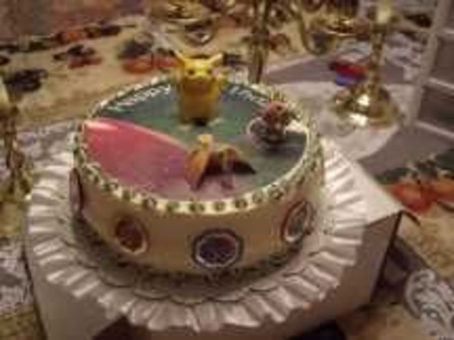 A birthday cake for an 8 year old boy who loves Pokemon. Yellow cake with b/c icing. Strawberry filling