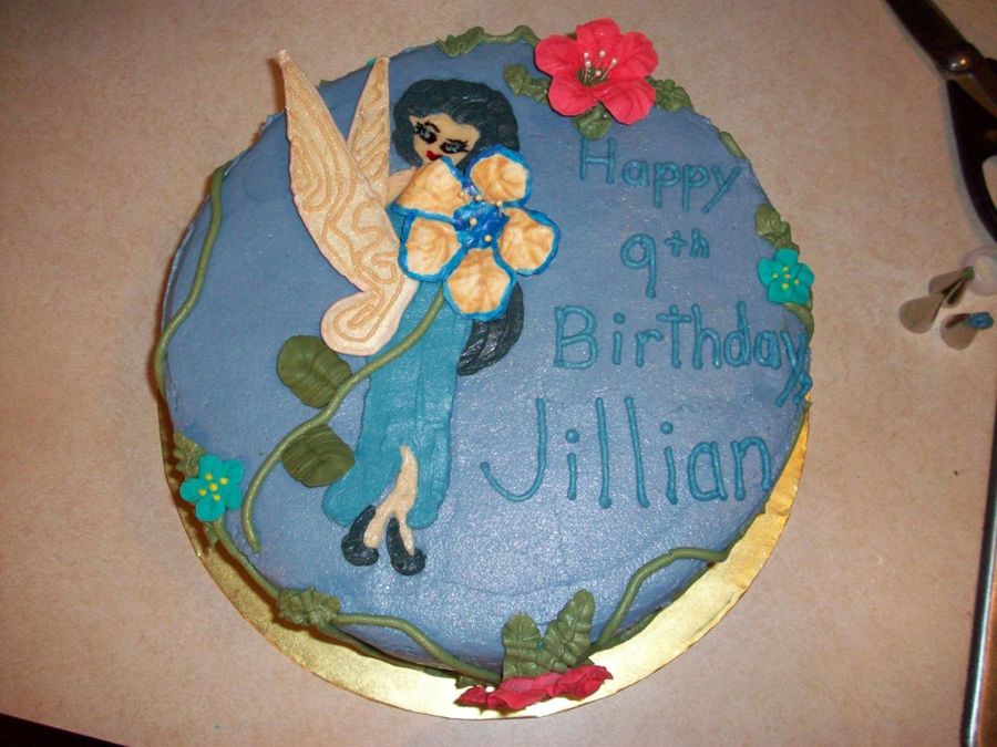 This cake is iced in a blue buttercream. The fairy is also buttercream, except for the wings, which I made with colorflow. All flowers are handmade royal icing.
