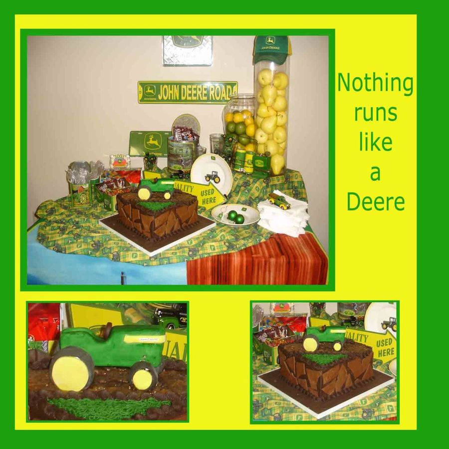 Little John Deere tractor made with rice krispie treats and fondant. Very simplestic design on a German Chocolate filling road and chocolate mosaic tiles on the sides of the cake. TFL
