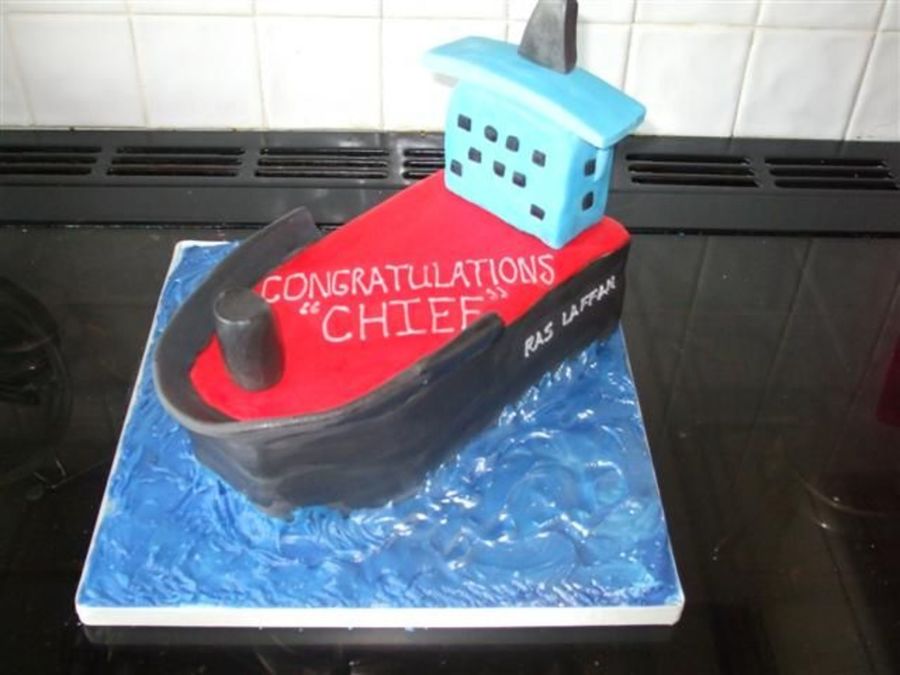 Fun to do! Was given photo of RAS Laffan oil tanker and asked to make a simplified version. Madeira cake for easy carving and all covered in sugarpaste and modelling paste. Water is royal icing.