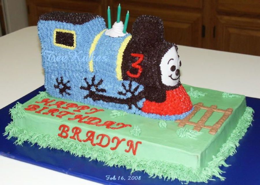 I made this cake for my little grandsons birthday, he was born on Valentine's Day. He wants to start collecting Thomas Tank Train stuff now so his birthday was the start of a new toy collection. Fun!! :) He loved the cake and wanted his piece of cake to be Thomas's face! LOL....Both cakes are marble cake with all buttercream filling and frosting. Thomas cake was made from the Wilton Choo Choo Train pan.