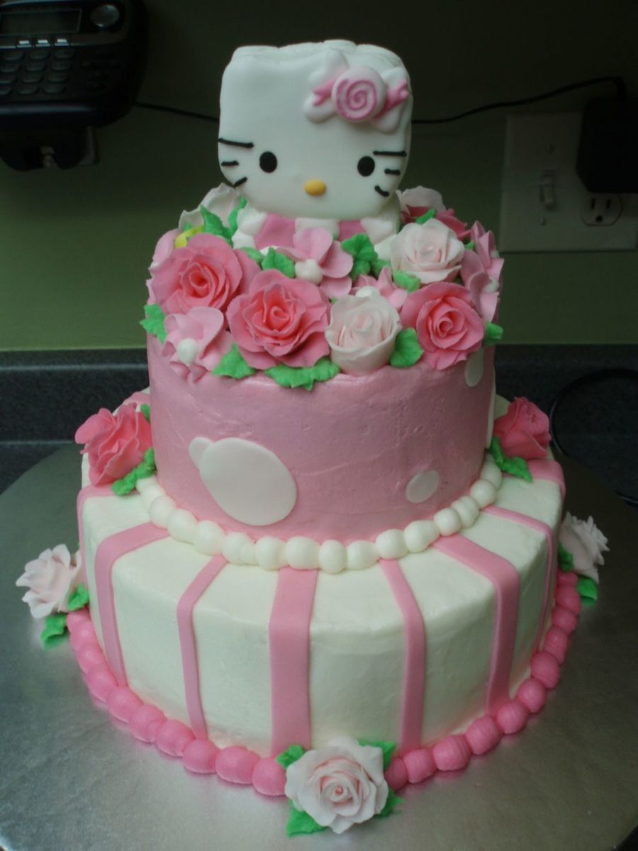 I made a cake similar to this last Oct during Wilton Course II for my sister's b-day. I went to the South Florida DOS yesterday & brought this as my display cake. The cakes are chocolate covered in BCD. The bottom tier's stripes are made out of fondant. The top tier has fondant circles, fondant roses & other flowers are made out of RI. The Hello Kitty is a store bought marshmallow lollipop. I have gotten so much inspiration for this cake & the first from boween & many others. Sorry I can't name all. TFL