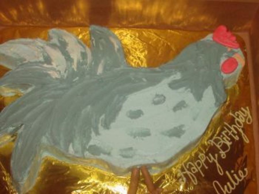 I made this cake for a friends 40th birthday. She's a large-animal veterinarian and she also raises chickens. The entire party was a chicken theme. All decoration is buttercream.