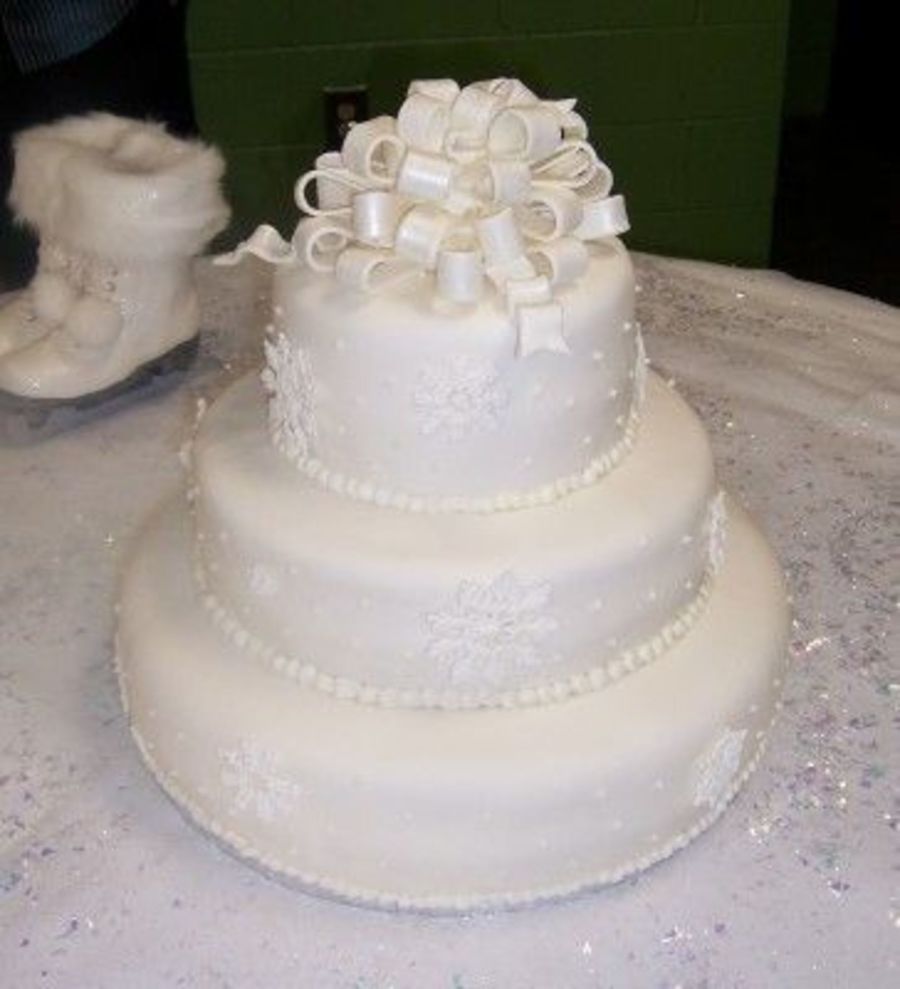 My 2nd wedding cake ever..my nerves have still not recovered!! Vanilla cake with strawberry filling, covered in MMF with royal icing snowflakes and a fondant bow painted with pearl dust.