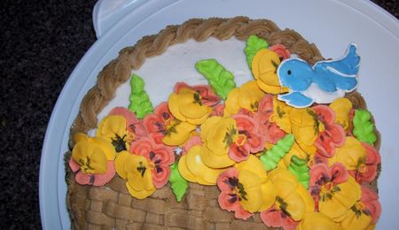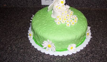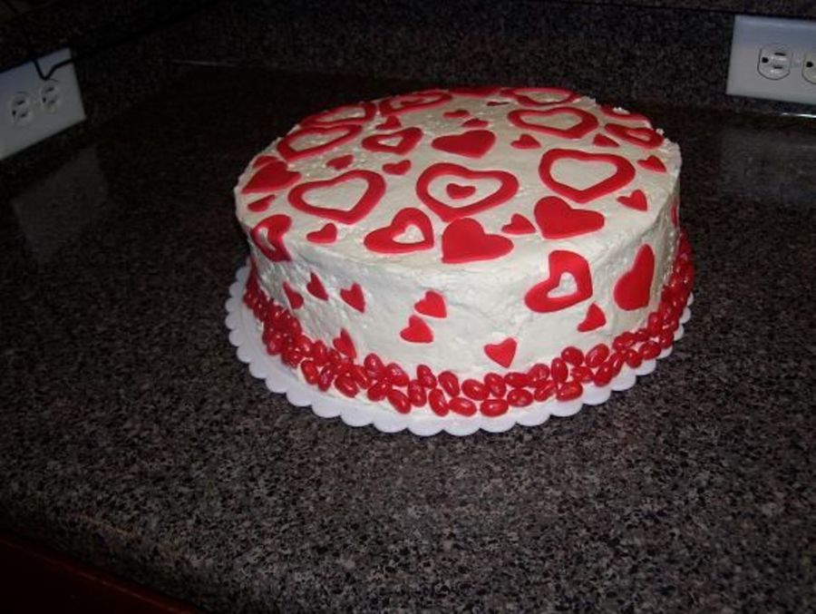 Co-workers have been bugging me to bring a cake in, but work has been so hectic. Put this one together in just two hours, so my icing is not smooth. This is a 10" Chocolate Cake with Andes mint chocolate filling. To cut down on decorating time I pipped a simple border, and then used cinnamon jellies and fondant heart cut-outs to decorate.