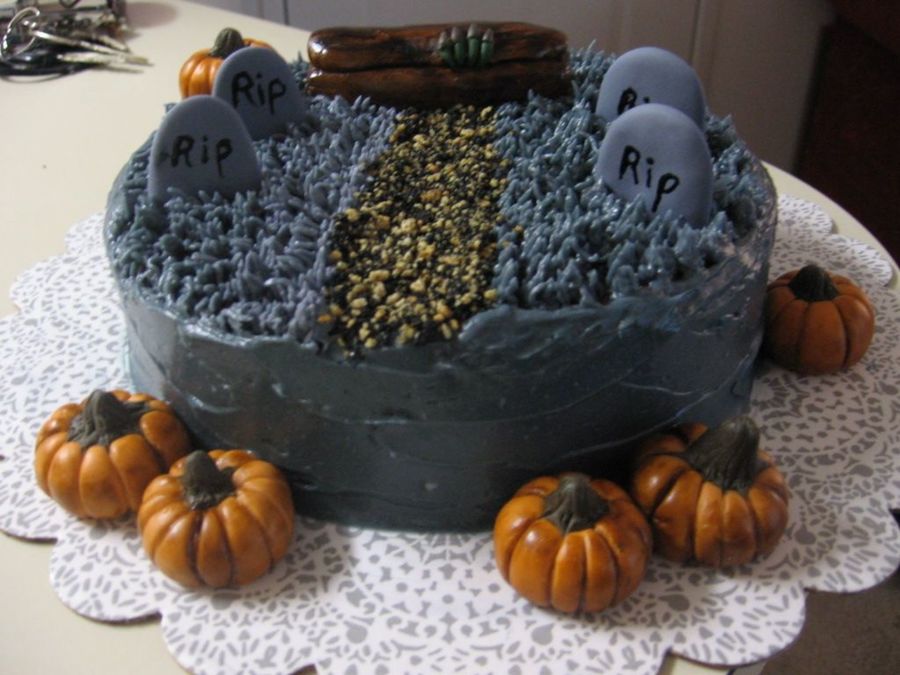 Ok...Ok....its a little late but here is my halloween cake! Buttercream for the dead grass and the rest are gumpast figures. The walkway is gramcracker crumbs with black food coloring. It was a much better idea in theory but it came out ok.