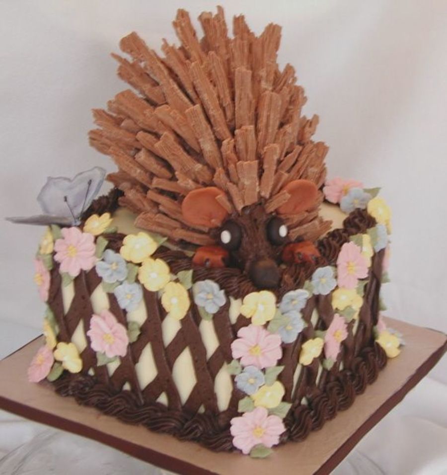 The porcupine is a chocolate cake, baked in Wilton's Mini Wondermold pans. It's covered with chocolate frosting, fondant eyes, paws, and ears. The quills are made from Cadbury Flake Bars. The rest of the cake is a white cake covered with vanilla and chocolate buttercream. Thanks for looking! :)