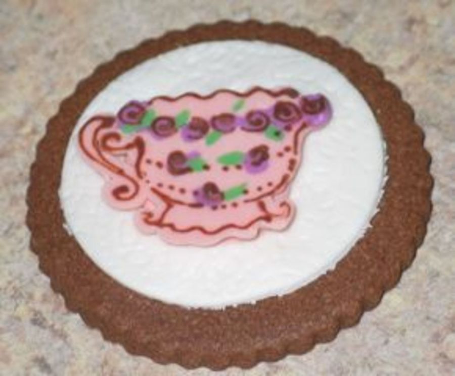 These are for my mom's birthday. I rolled a doily over the fondant to give the background texture and then did a chocolate transfer teacup.