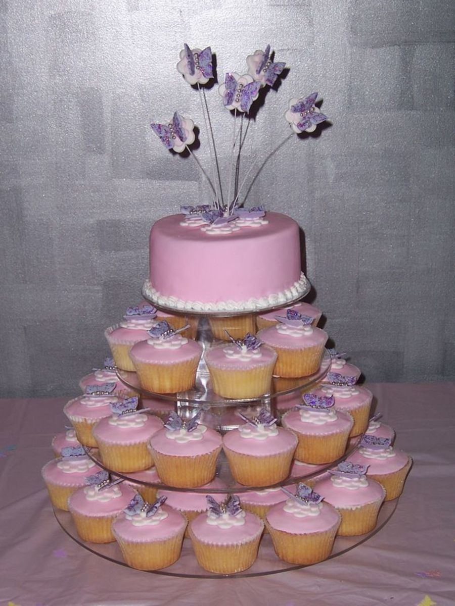 I made this for my daughters 1st birthday. White choc mud cake covered with fondant. Butterflies are made with fondant and decotated with silver cachous and purple glitter. This was my 1st attempt at cupcakes. I did have a plaque to sit around the wires on top cake but it broke that morning, so I just placed some extra butterflies I had around instead.