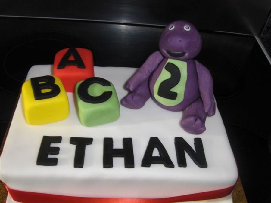 This is a Barney cake I made for a friends little boy. I wasnt too pleased with the barney the colour wasnt blended as well as it could have been and the arms cracked a little as they started to dry.