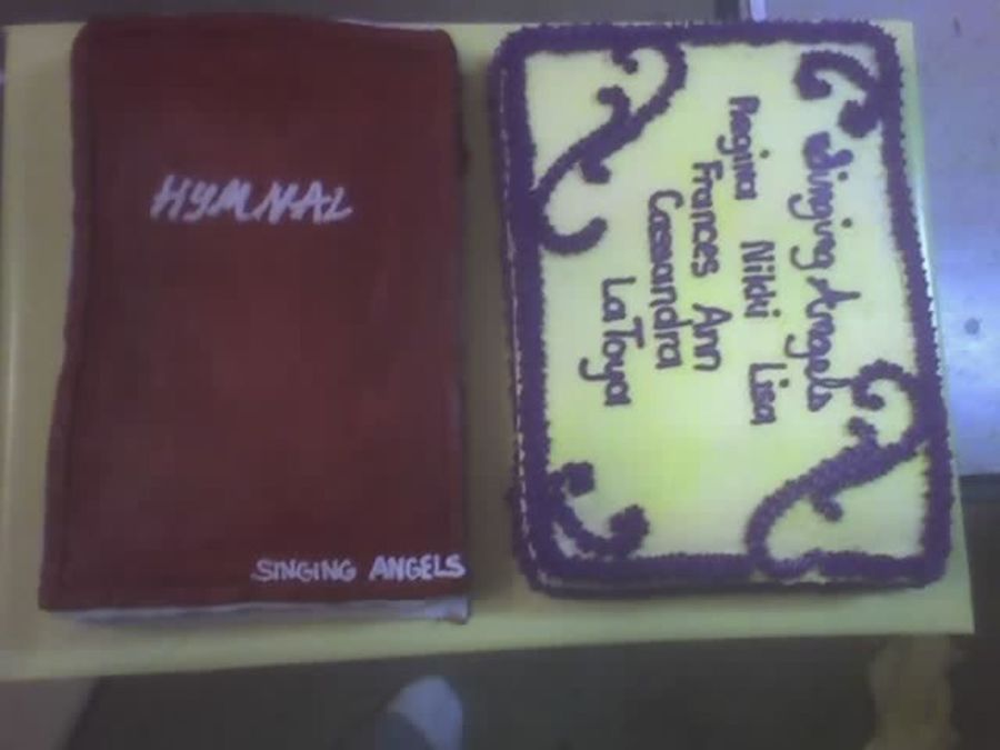 this is a hymnal and a small cake with members name. the hymnal is upside down but i dont think they noticed