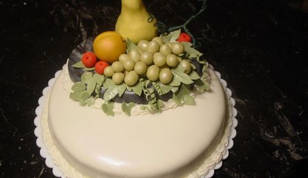 Large chocolate mocha cake with chocolate mocha mousse filling. Small white chocolate cake with white chocolate raspberry filling. SMBC w/chocolate fudge piping. Modeling chocolate roses and leaves.
