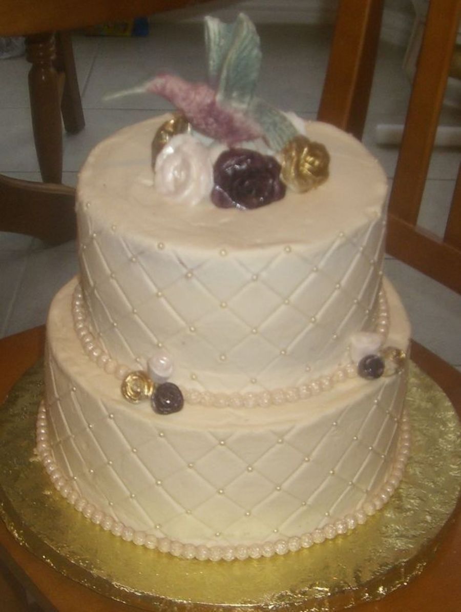 This was for a 90 year old woman who loves hummingbirds. They wanted something elegant with a hummingbird on top. Buttercream icing. Fondand roses and chocolate hummingbird