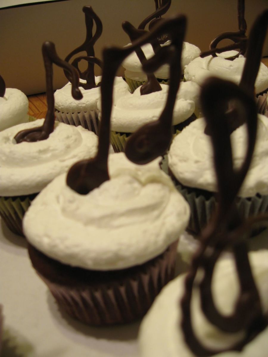 This was my first attempt with piping melted chocolate. I have done it one other time since then and had better control. **HInt: Pipe a half inch or so extending down from the symbol to stick into the cupcake, so as to expose the whole symbol. Ask me if you need clarification on that. :)