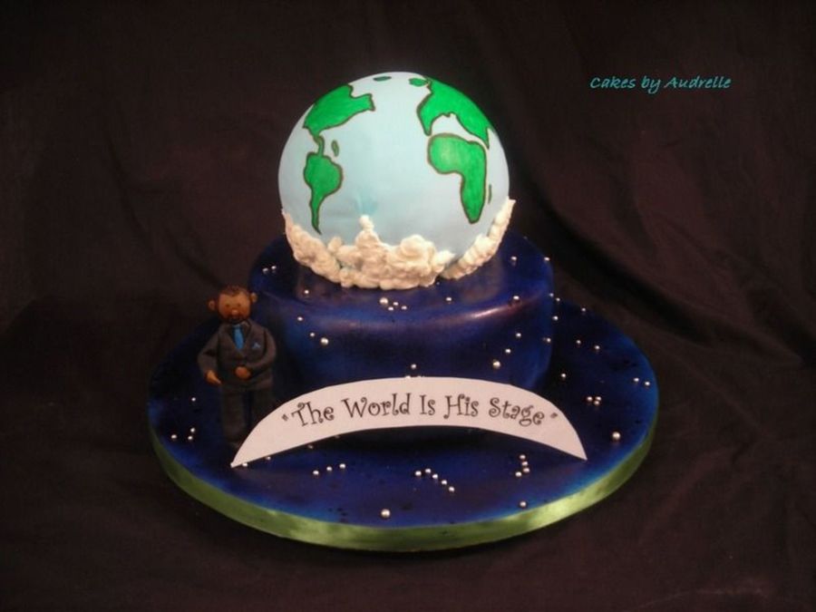 Saw a cake like this from another site done by someone named "Wild Cakes" and I had to try it. What I differently is that I extended the "sky" to the cake board and I added clouds to it as well as the banner. The "sky" is airbrushed with silver dragees added and the "earth" is colored fondant and hand drawn continents (had to look at a map on my son's cell phone). I am a critique group member.