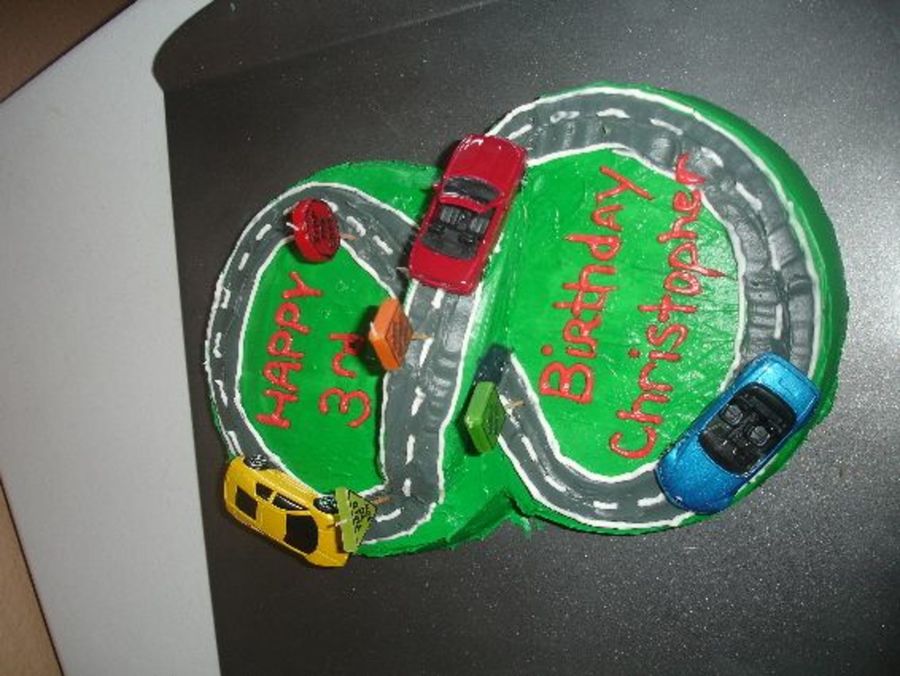 Racing cake I did for my sons 3rd birthday last June. I had no training or anything, I just recently took wilton course 1, so hopefully I will get better as time goes by. The cars are toys, and the candles are little road signs, (i think I found them at party city)...