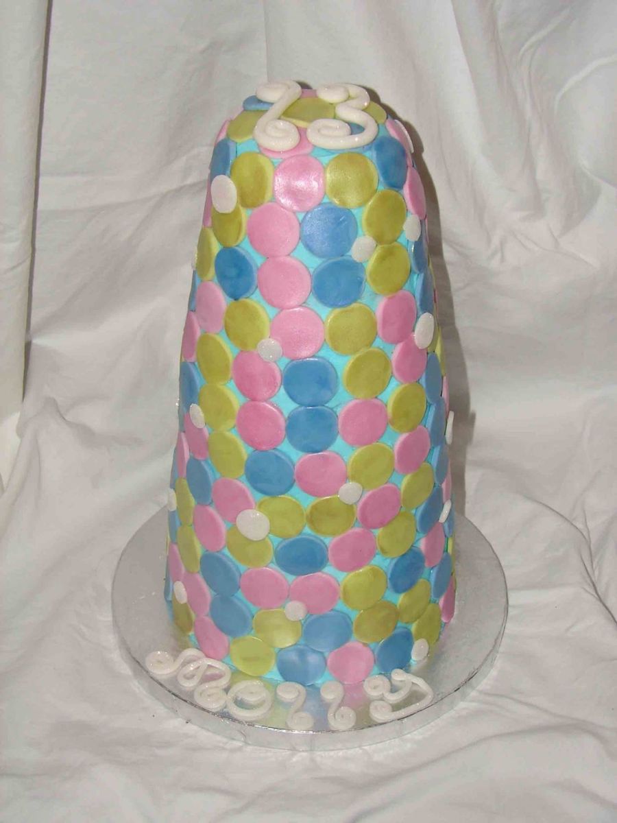 I was trying to figure out height vs. support in this cake. The cake is 9 layers tall, starting at 9" bottom and 4" top. Used foam core every three layers and drove dowel down through center. Traveled perfectly with no slipping/bulging (whew!). I was a little disappointed in the look though, had a different design in my head. I wanted it to look like shiny sequins. I guess that I didn't use the right kind of dust .... oh well!