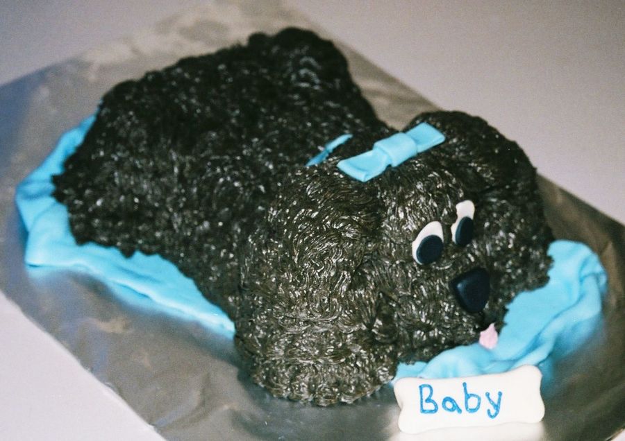 made for a baby shower, chocolate cake and bc icing. loaf pan for body and cut cupcakes for legs, tail and head.
