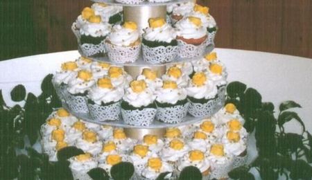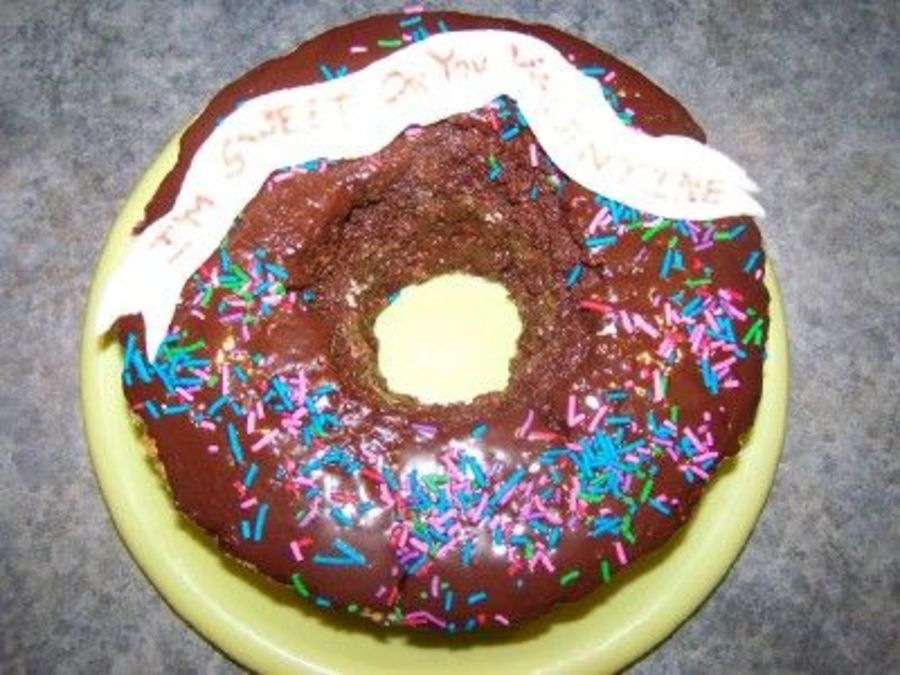 10" round with the centre cut out of it. Melted choc. icing and iced the top for a shiny look and added sprinkles to it